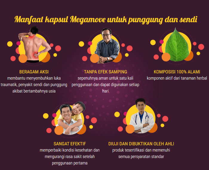 Megamove – obat alami yang dapat menghilangkan gejala nyeri dan berbagai patologi sistem muskuloskeletal, dan juga cocok untuk pengobatan berbagai penyakit, seperti: